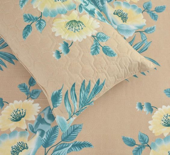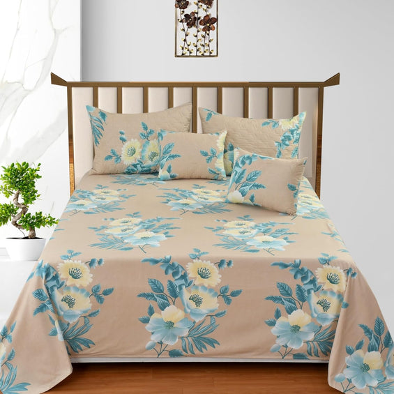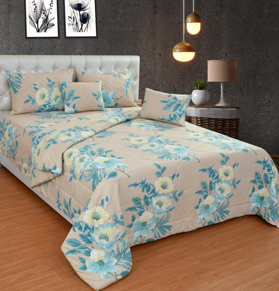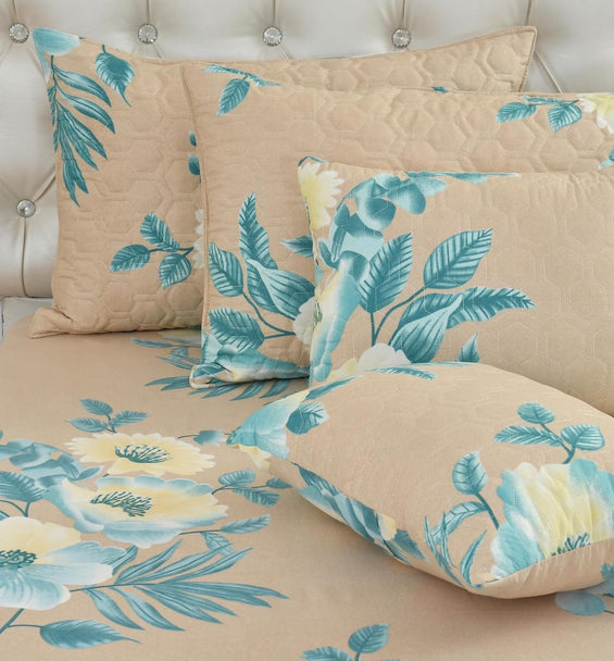 Floral Beige Double Bedding Set with Reversible Comforter, Flat Bedsheet, Pillow covers & Cushions, 6 Pcs
