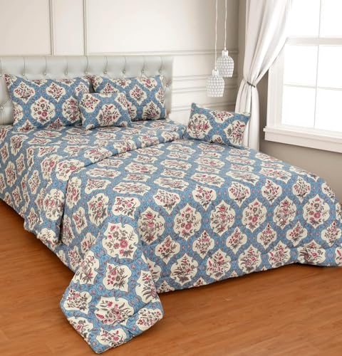 Jaipuri Print Double Bedding Set with Reversible Comforter, Flat Bedsheet, Pillow covers & Cushions, 6 Pcs