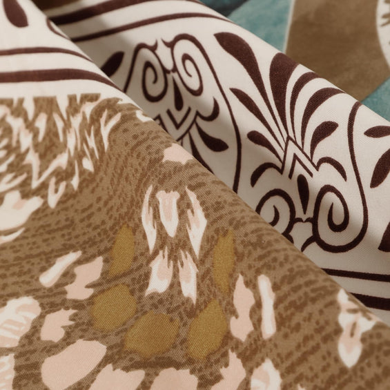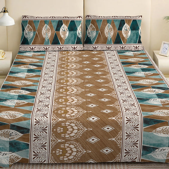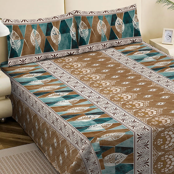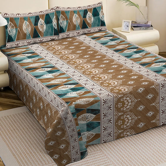 King Bed Bedsheet with Pillow Covers (Teal Geo Leaves)