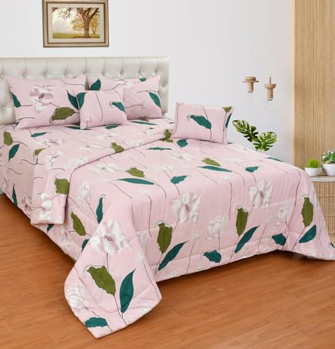 Pink Rose Double Bedding Set with Reversible Comforter, Flat Bedsheet, Pillow covers & Cushions, 6 Pcs